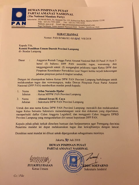 Surat ditandatangani Ketua Umum DPP PAN Zulkifli Hasan dan Sekretaris Jenderal DPP PAN Eddy Soeparno. Surat ditujukan kepada Komisi Pemilihan Umum (KPU) Provinsi Lampung.