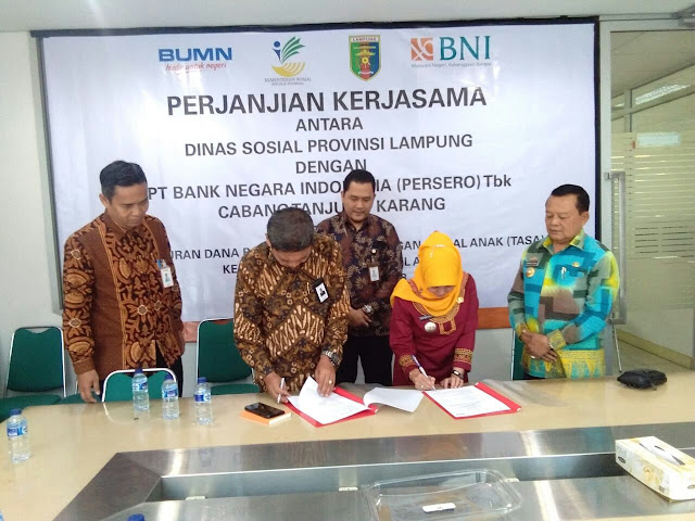 Kepala Dinas Sosial Provinsi Lampung Sumarju Saeni menyaksikan Penandatanganan Kerjasama antara Kepala Bidang Rehabilitasi Sosial Dinsos Lampung; Ratna Fitriani bersama Pimpinan PT. BNI (Persero) tbk Cabang Tanjung Karang Tri Satia Hadi tentang Bantuan Sosial Tabungan Sosial Anak (TASA) pada Kamis 26/07/2018 di Ruang Rapat PT.BNI Cabang Tanjung Karang.