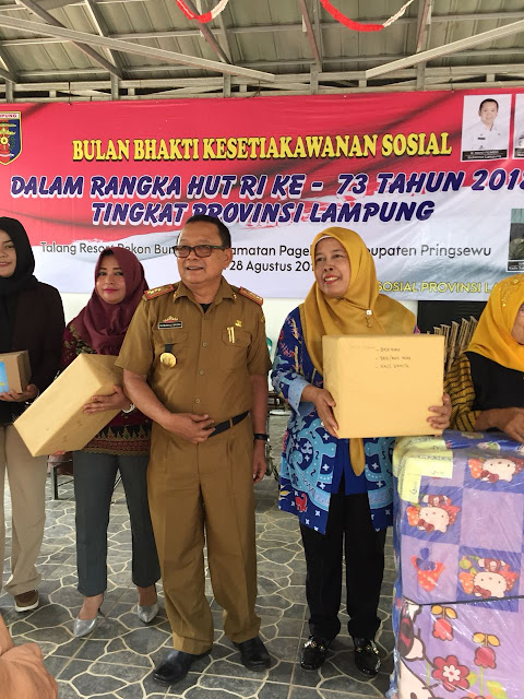 Demikian sambutan tertulis Gubernur Lampung, M.Ridho Ficardo yang dibacakan oleh Kepala Dinas Sosial Provinsi Lampung; Sumarju Saeni dalam acara Bhakti Sosial Peringatan HUT RI Ke 73 Tingkat Provinsi Lampung ( 28/8/2018) di Kecamatan Pagelaran, Pringsewu.