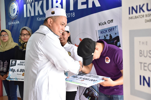 Kompetisi wirausaha tersebut berhasil dimenangkan oleh 4 startup mahasiswa IIB Darmajaya. Mereka mendapatkan bantuan modal usaha yang penyerahannya dilakukan secara simbolis pada Launching Produk Tenant Inkubitek di Ruang Seminar Grow+ Co Workhing Space Darmajaya, kemarin (04/10).