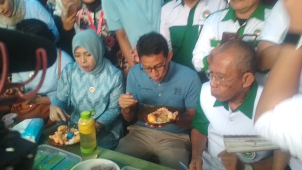 Calon Wakil Presiden (Cawapres) Sandiaga Uno kunjungi Pasar Tugu untuk sarapan pagi sebelun rangkaian kegiatan yang dilakukan di kota Bandarlampung, Selasa (9/10/2018).