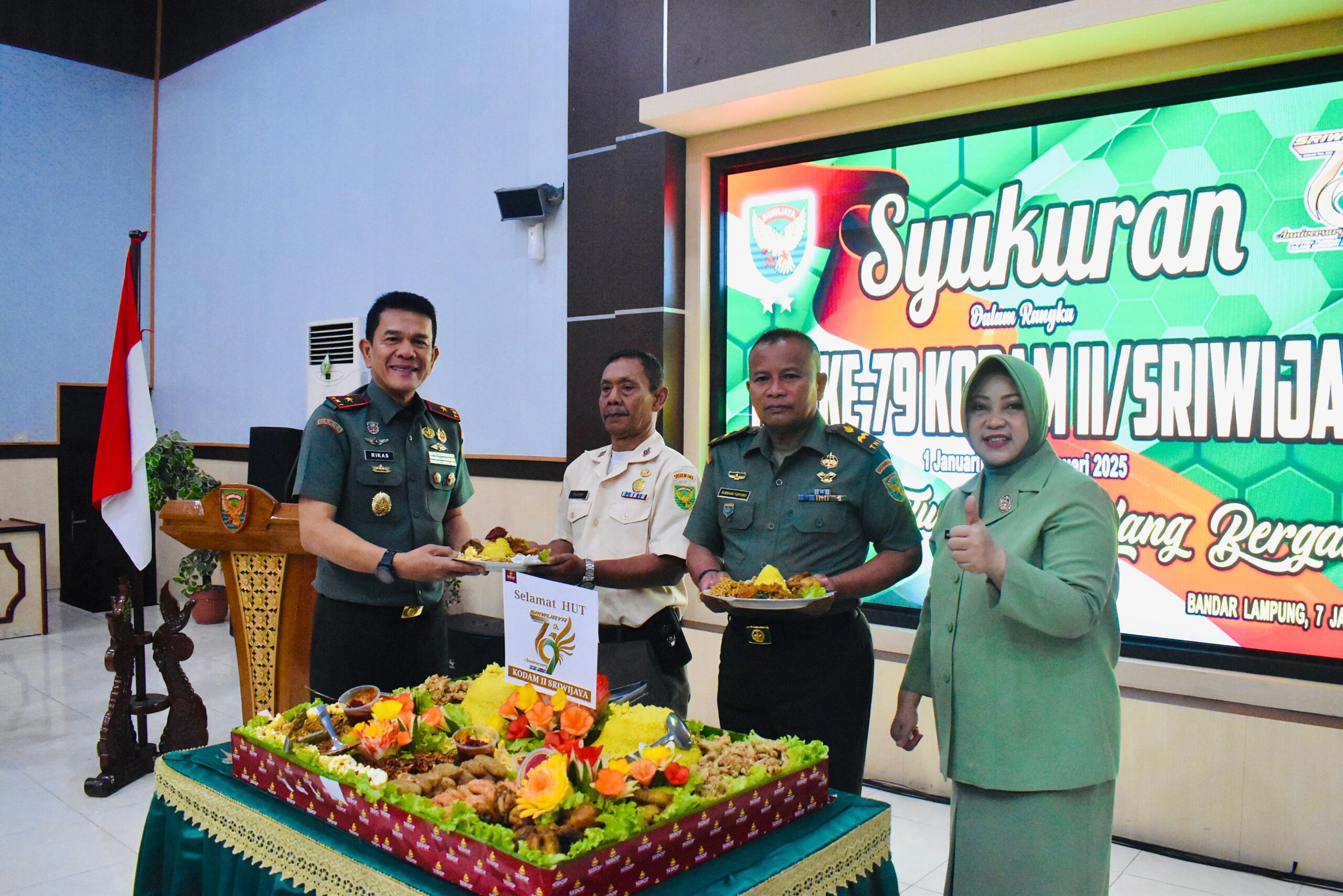 Dalam rangka memperingati Hari Ulang Tahun (HUT) Kodam II/Sriwijaya yang ke-79 Tahun 2025, Danrem 043/Gatam Brigjen TNI Rikas Hidayatullah, S.E., M.M., bersama dengan anggota Makorem melaksanakan kegiatan syukuran yang berlangsung di Ruang A. Yani Makorem 043/Gatam Jl.Teuku Umar Penengahan Bandar Lampung. Selasa (07/01/2025)