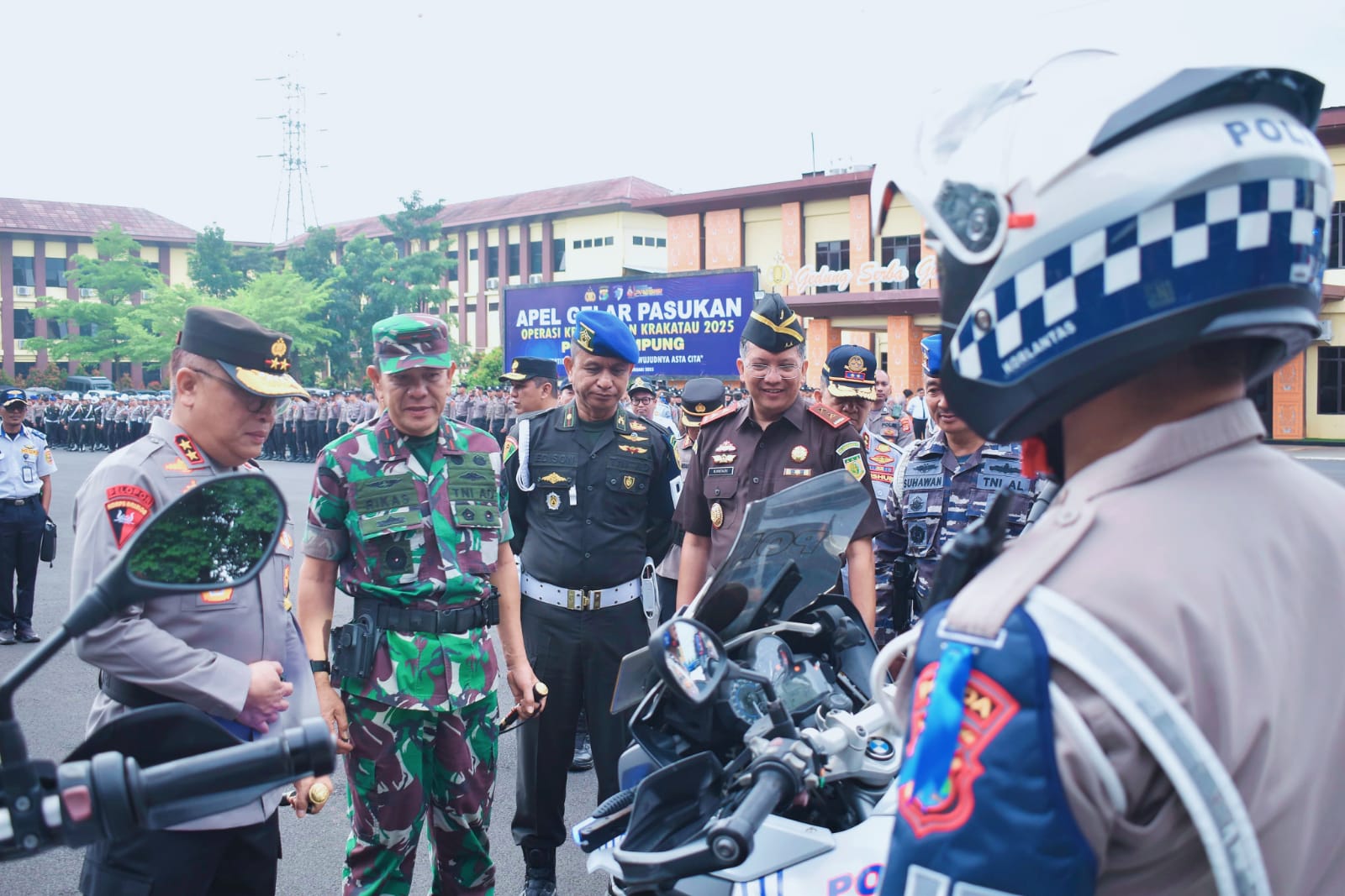 bertempat di lapangan upacara Mapolda Lampung, Jl. Terusan Ryacudu, Way Hui, Kecamatan Jati Agung, Kabupaten Lampung Selatan, Komandan Korem 043/Gatam Brigjen TNI Rikas Hidayatullah, S.E., M.M., menghadiri Apel Gelar Pasukan Operasi Keselamatan Krakatau 2025. Senin (10/02/2025),