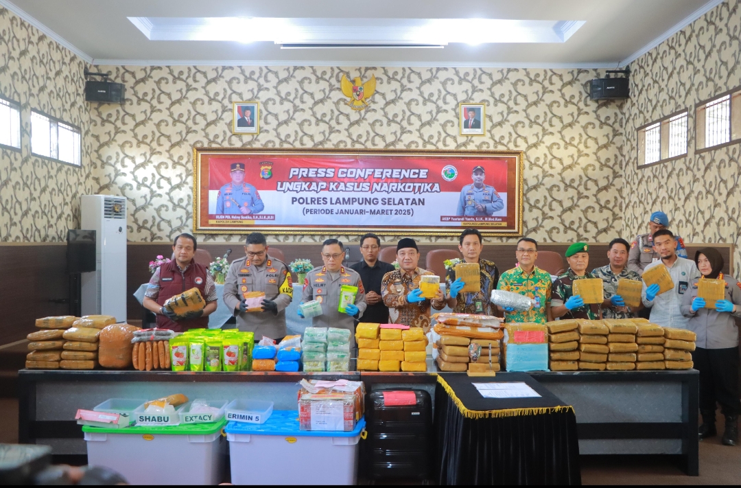 Polres Lampung Selatan Polda Lampung menggelar press conference sekaligus pemusnahan barang bukti narkoba periode Januari hingga Maret 2025. Jumat(21/3/25)
