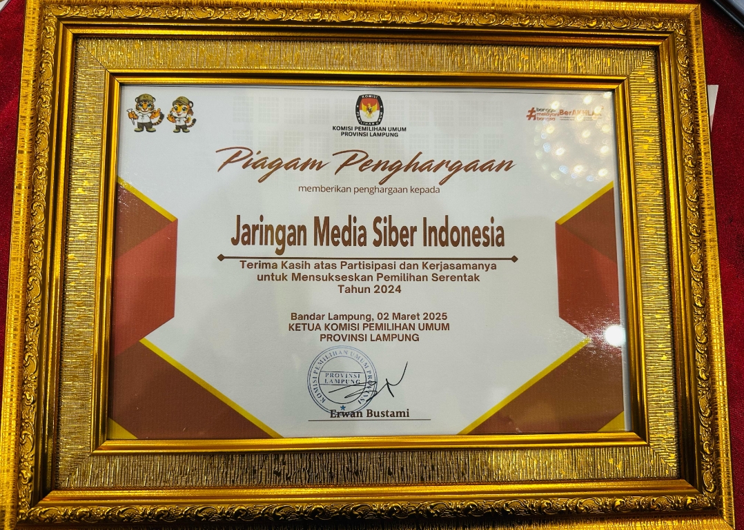 Jaringan Media Siber Indonesia (JMSI) Lampung menerima penghargaan dari Komisi Pemilihan Umum (KPU) Provinsi Lampung atas kontribusinya dalam menyukseskan Pemilu 2024. Piagam penghargaan tersebut diserahkan di Emersia Hotel, Bandarlampung, Minggu (2/3/2025).