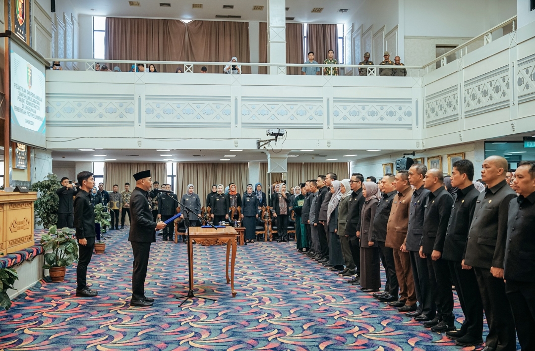 Gubernur Lampung Rahmat Mirzani Djausal melantik dan mengambil sumpah/janji jabatan 59 pejabat administrator di Lingkungan Pemerintah Provinsi Lampung di Balai Keratun Lantai III, Kompleks Kantor Gubernur Lampung.Jumat (25/4/2025),