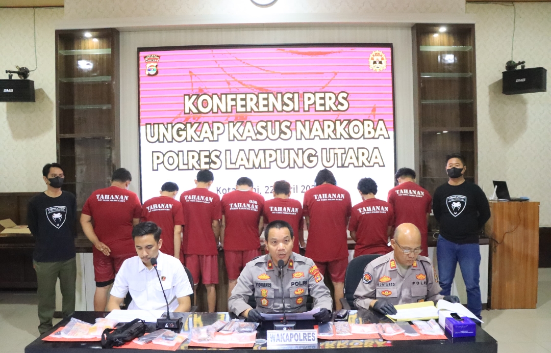 Satuan Narkoba Polres Lampung Utara mengamankan 8 orang, yang merupakan Bandar dan Kurir narkoba, di periode April 2025, dari sejumlah TKP di dua Kecamatan, yaitu Kecamatan Sungkai Utara dan Kotabumi Selatan.