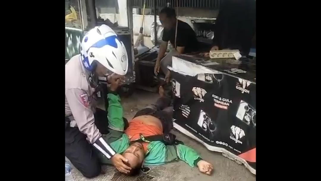 Personel Sat Lantas Polresta Bandar Lampung bergerak cepat memberikan pertolongan pertama kepada seorang pengendara ojek online yang tiba-tiba pingsan saat melintas di Jalan Jenderal Sudirman – Prof. M Yamin, Bandar Lampung, Minggu (13/4/2025).