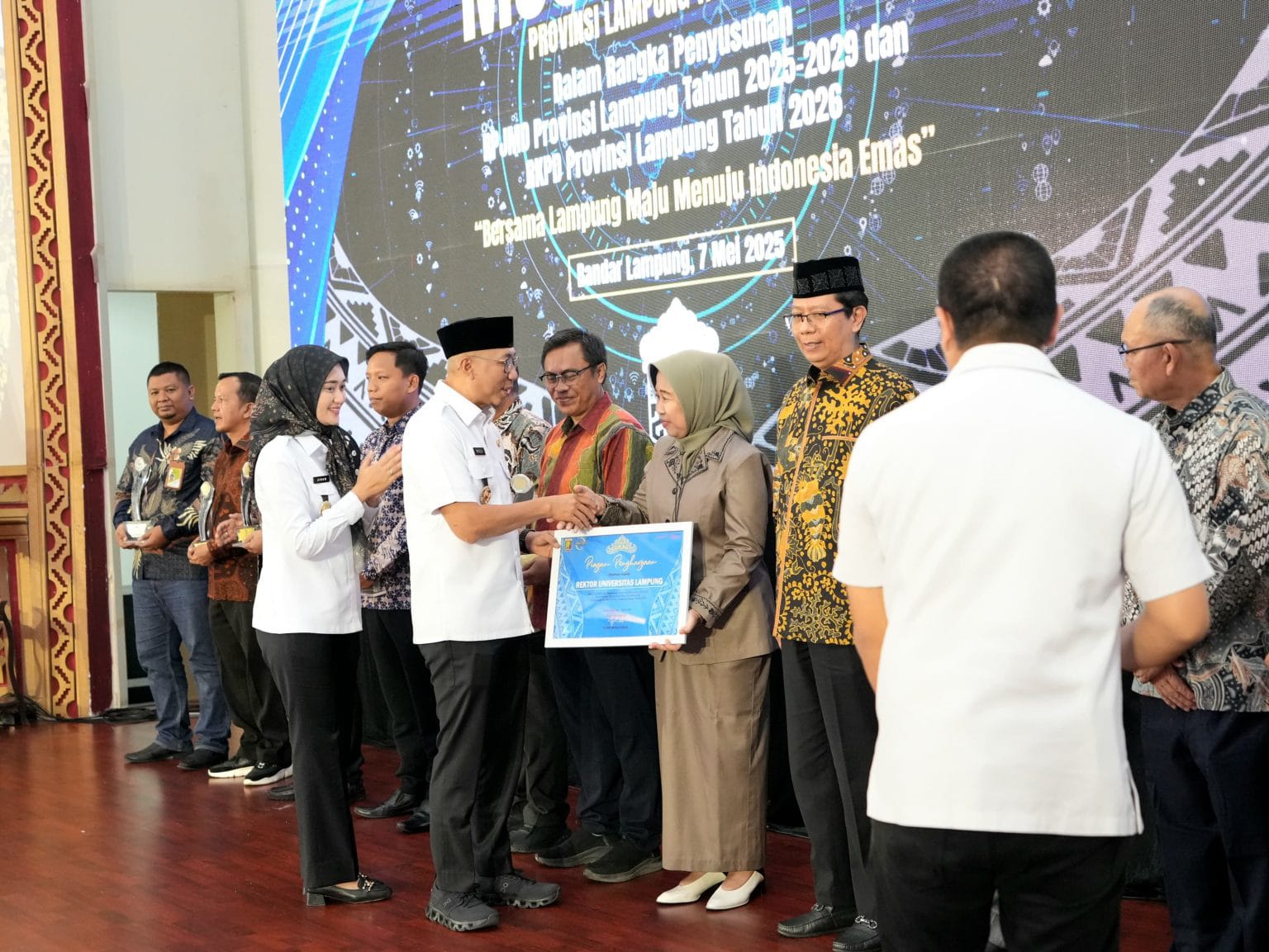 (Unila): Rektor Universitas Lampung (Unila) Prof. Dr. Ir. Lusmeilia Afriani, D.E.A., IPM., ASEAN Eng., menerima penghargaan atas peran aktifnya dalam menjadi fasilitator dan kolaborator focus group discussion (FGD) tematik untuk penyusunan Rencana Pembangunan Jangka Menengah Daerah (RPJMD) Provinsi Lampung 2025–2029.
