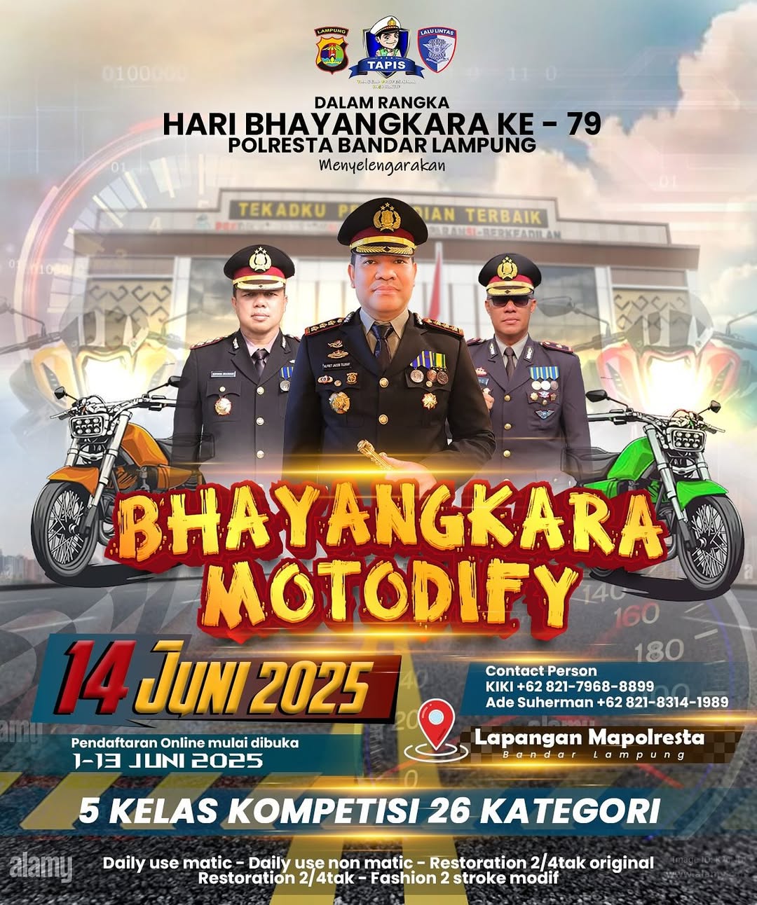 Polresta Bandar Lampung bakal menggelar lomba kontes modifikasi motor dalam rangka memeriahkan Hari Bhyangkara Ke-79, Tahun 2025. Lomba ini membuka 5 kelas kompetisi dengan 26 kategori.