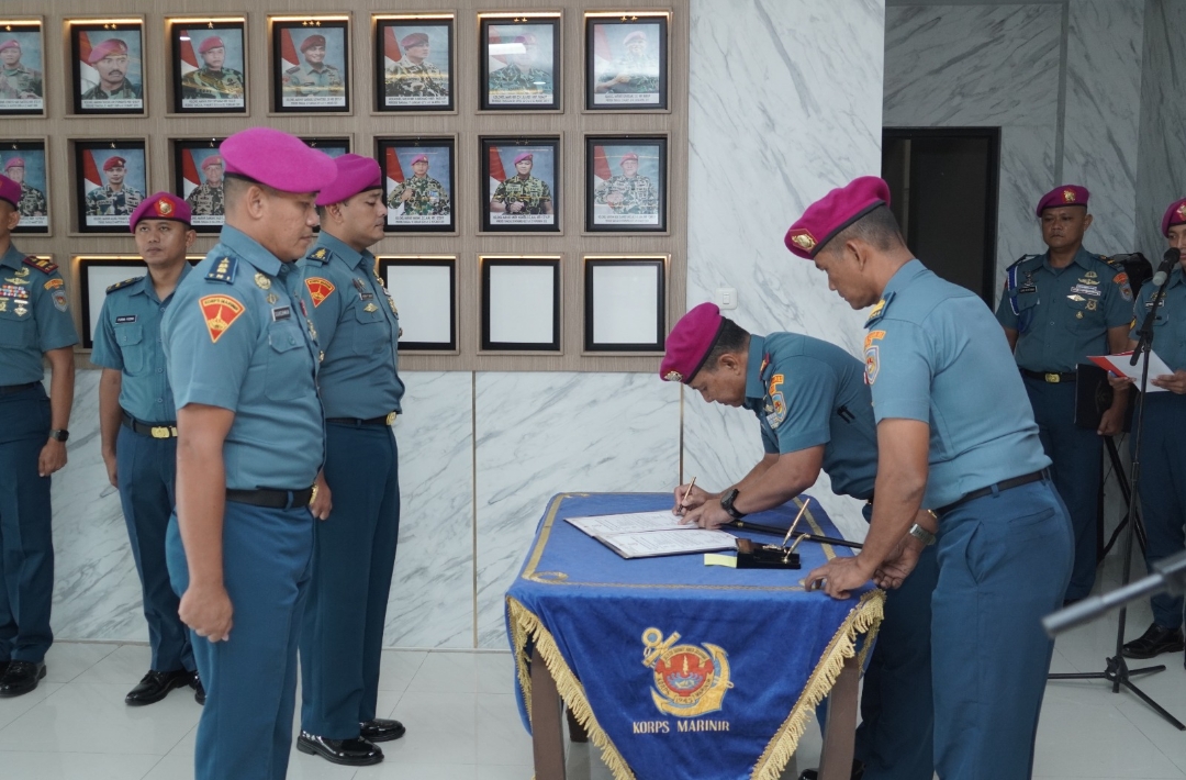 Danbrigif 4 Mar/BS Kolonel Marinir Supriadi Tarigan, S.I.P., M.M., pimpin Serah Terima Jabatan (Sertijab) Wakil Komandan (Wadan) Brigif 4 Mar/BS dan Perwira Staf Operasi (Pasops) Brigif 4 Mar/BS di Lobi Mako Brigif 4 Mar/BS, Piabung, Kec. Padang Cermin, Kab. Pesawaran Lampung. Rabu (16/07/2025).