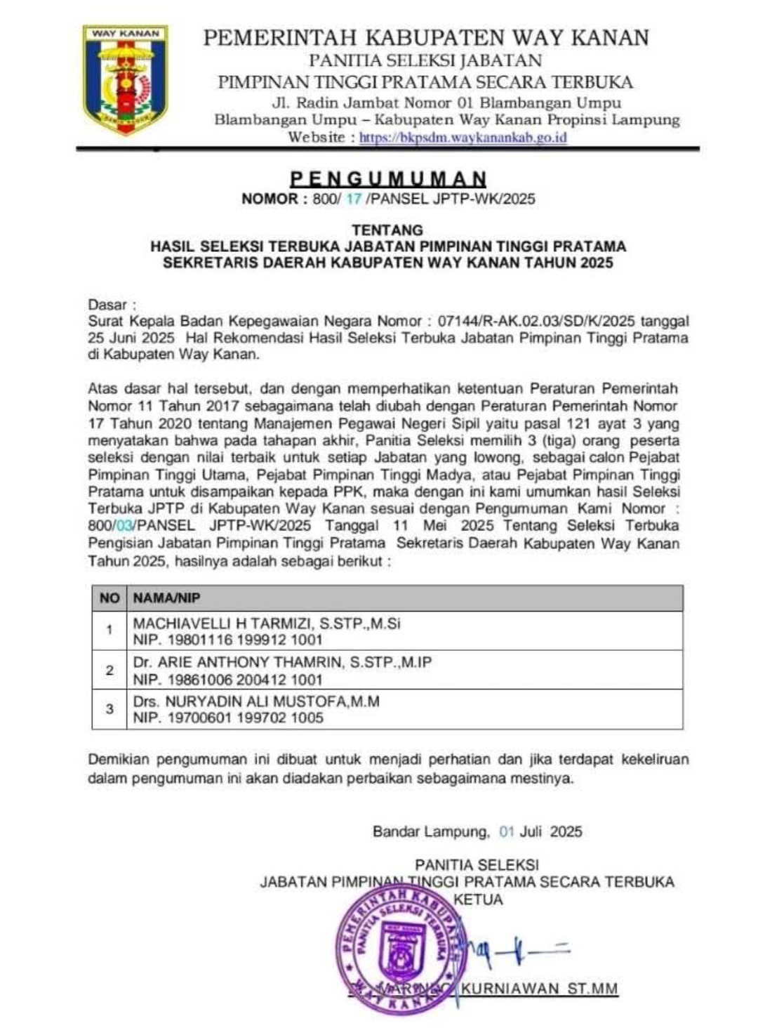 Pemerintah Kabupaten Way Kanan melalui Panitia Seleksi Jabatan Pimpinan Tinggi Pratama Secara Terbuka mengeluarkan Pengumuman Nomor : 800/17/PANSEL JPTP-WK/2025 Tentang Hasil Seleksi Terbuka Jabatan Pimpinan Tinggi Pratama Sekretaris Daerah Kabupaten Way Kanan Tahun 2025 tanggal 1 Juli 2025.