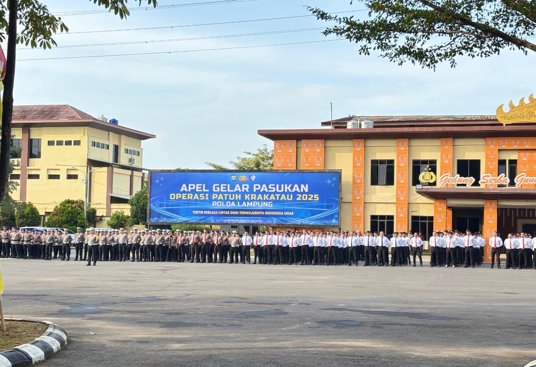 Polda Lampung menggelar Apel Pasukan Operasi Patuh Krakatau 2025 secara serentak di seluruh Indonesia, sebagai bentuk komitmen Polri dalam menekan angka pelanggaran dan kecelakaan lalu lintas. Senin(14/7/25)
