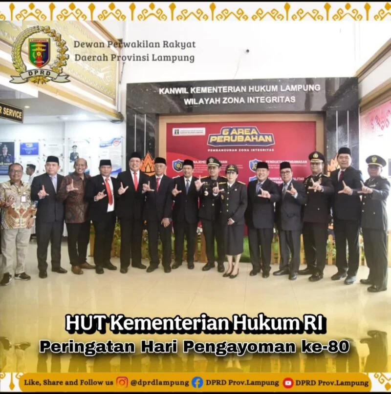 Anggota Komisi I DPRD Provinsi Lampung, Bapak Mohammad Reza Berawi, SH., MH., hadir sebagai perwakilan lembaga legislatif dalam acara tersebut. Dalam kesempatan itu, Reza Berawi menyampaikan apresiasi atas peran Kementerian Hukum dan HAM dalam menjaga supremasi hukum dan mendorong reformasi hukum yang berkeadilan di Indonesia, khususnya di Provinsi Lampung.