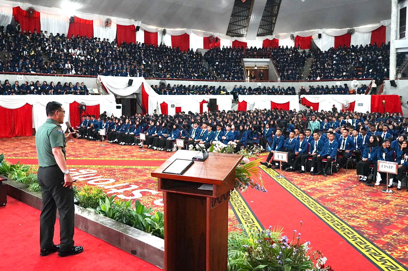 Komandan Korem 043/Gatam Brigjen TNI Haryantana, S.H., memberikan materi tentang Kehidupan Berbangsa, Bernegara, dan Pembinaan Kesadaran Bela Negara pada Program Pengenalan Kehidupan Kampus Mahasiswa Baru (PKKMB) TA. 2025 kepada 4.000 mahasiswa baru Universitas Lampung (Unila). Kegiatan berlangsung di Gedung Serba Guna (GSG) Unila, Jl. Prof. Dr. Ir. Sumantri Brojonegoro, Bandar Lampung, Kamis (14/08/2024).
