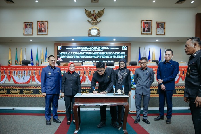 Kesekapatan tersebut ditandai dengan Penandatangan Persetujuan Bersama terhadap Raperda APBD Tahun Anggaran 2026, yang dilakukan Wakil Gubernur Lampung Jihan Nurlela dan Ketua DPRD Lampung Ahmad Giri Akbar.