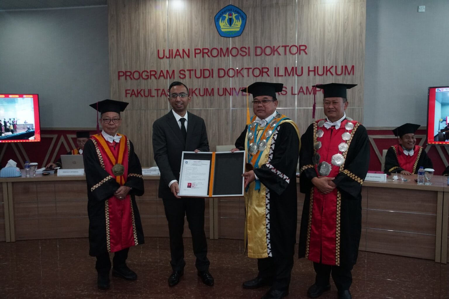 Dekan FH Unila Dr. M. Fakih, S.H., M.S., juga turut hadir dan berperan sebagai salah satu penguji internal. Ketua Program Studi Doktor Ilmu Hukum, Prof. Dr. Muhammad Akib, S.H., M.Hum., bertindak sebagai sekretaris penguji.