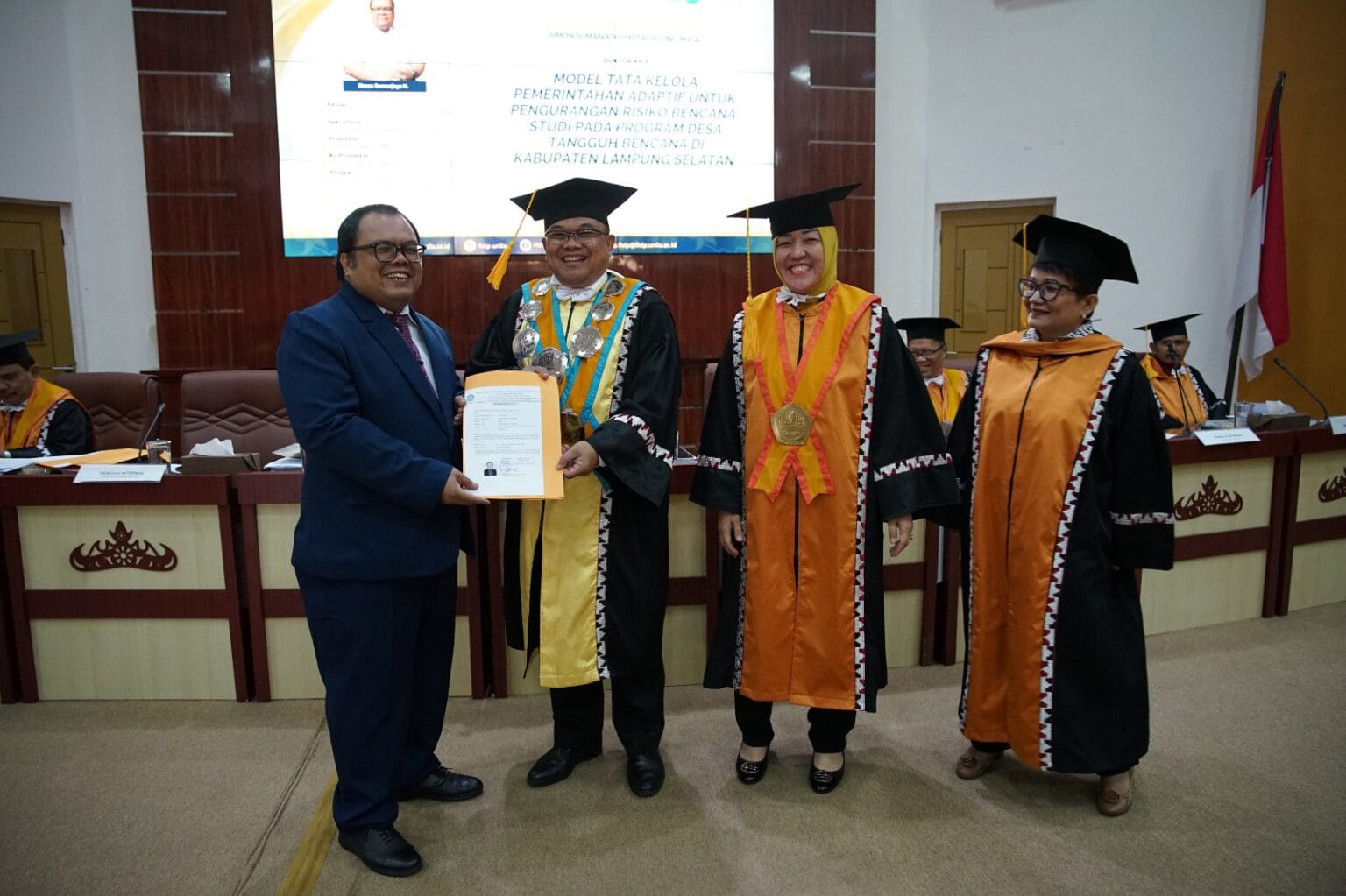 Disertasi berjudul “Model Tata Kelola Pemerintahan Adaptif untuk Pengurangan Risiko Bencana: Studi pada Program Desa Tangguh Bencana di Kabupaten Lampung Selatan.”