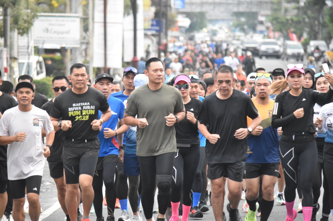 Bersama Menteri Koordinator Infrastruktur dan Pembangunan Republik Indonesia H. Agus Harimurti Yudhoyono, M.Sc., M.P.A., M.A., prajurit Kodam XXI/Radin Inten beserta jajaran mengikuti kegiatan olahraga bersama di Kota Bandar Lampung, Selasa (14/10/2025).