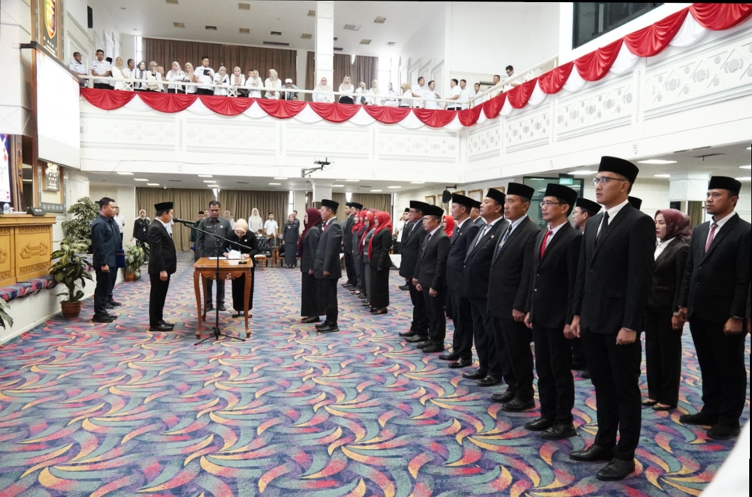 Gubernur Lampung diwakili oleh Sekretaris Daerah Provinsi Lampung, Marindo Kurniawan melantik sekaligus mengambil sumpah jabatan Pejabat Administrator dan Pejabat Pengawas di Lingkungan Pemerintah Provinsi Lampung yang digelar di Balai Keratun Lantai III, Kompleks Kantor Gubernur Lampung, Rabu (21/01/2026).