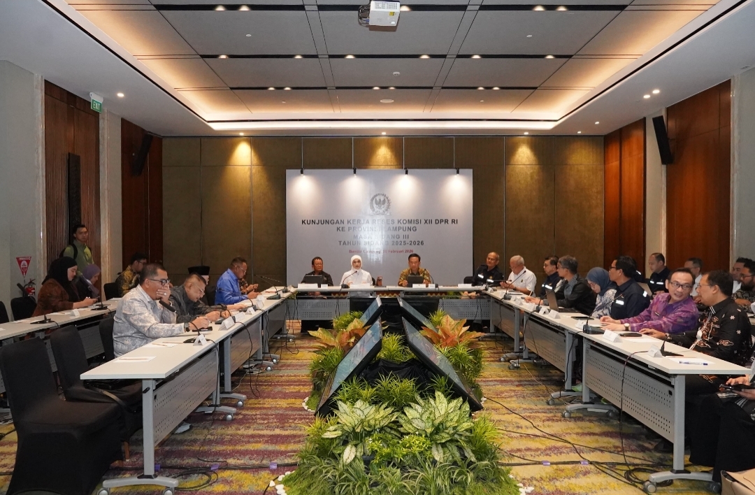 Sekretaris Daerah Provinsi Lampung, Marindo Kurniawan, mewakili Gubernur Lampung mendampingi Komisi XII DPR RI melakukan kunjungan kerja reses untuk pengawasan langsung pengelolaan sektor energi dan lingkungan hidup di Provinsi Lampung, Jumat (20/2/2026). Kegiatan tersebut berlangsung di Hotel Radisson, Bandar Lampung, dan dihadiri jajaran pemerintah pusat, daerah, serta pelaku industri migas dan energi.