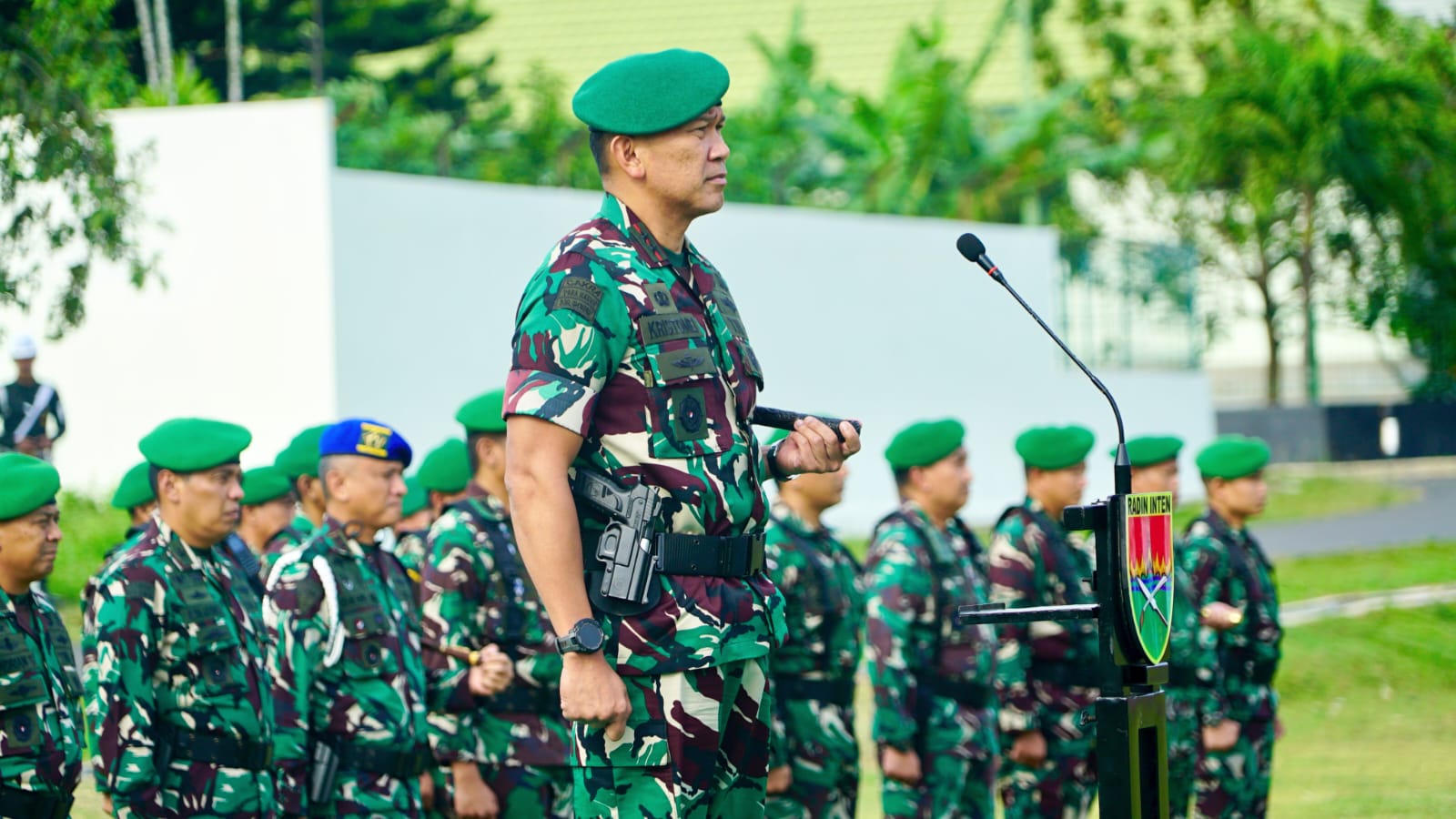 Pangdam XXI/Radin Inten, Mayor Jenderal (Mayjen) TNI Kristomei Sianturi, S.Sos., M.Si. (Han), memimpin apel Siaga I Kodam XXI/RI, dalam rangka Antisipasi Bangsit Dalam Negeri Akibat Konflik Timur Tengah yang bertempat di Lapangan Satlog, Kec. Way Halim, Kota Bandar Lampung. Selasa (03/03/2026).