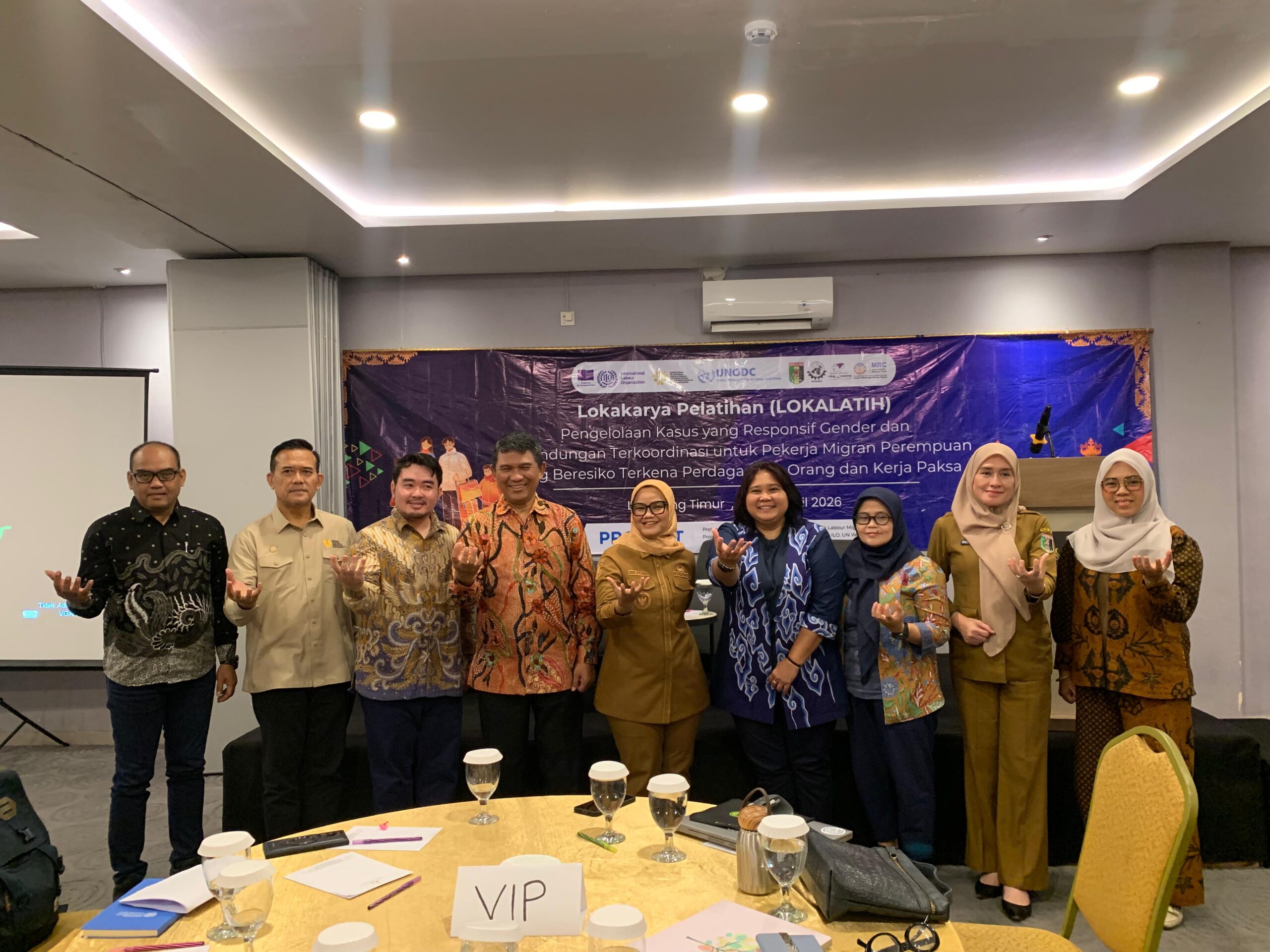Lampung Timur, 21 April 2026 — Pemerintah Kabupaten Lampung Timur bersama Kementerian Pelindungan Pekerja Migran Indonesia (KP2MI/BP2MI), International Labour Organization (ILO), United Nations Office on Drugs and Crime (UNODC), Serikat Buruh Migran Indonesia (SBMI), dan Solidaritas Perempuan Sebay Lampung memperkuat komitmen pelindungan pekerja migran perempuan melalui penyelenggaraan Lokakarya Pelatihan (Lokalatih) Pengelolaan Kasus Responsif Gender dan Layanan Perlindungan Terkoordinasi.